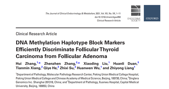 2021年1月初,yl6776永利集团与北京协和医学院病理科梁志勇教授和吴焕文教授团队共同合作,利用yl6776永利集团独有的DNA甲基化单倍型技术区分滤泡型甲状腺癌与良性滤泡型甲状腺瘤的研究论文“DNA Methylation Haplotype Block Markers Efficiently Discriminate Follicular Thyroid Carcinoma from Follicular Adenoma”,正式发表于国际学术期刊The Journal of Clinical Endocrinology & Metabolism上。