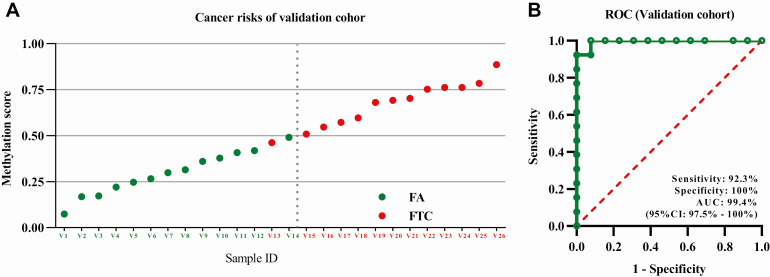 研究团队将经病理诊断为FTC或FA的患者随机分为一个训练组(33个FTC和33个FA样本)和一个验证组(13个FTC和13个FA),并另外招募了36名TT-UMP患者,对其组织样本的甲基化特征进行了研究。