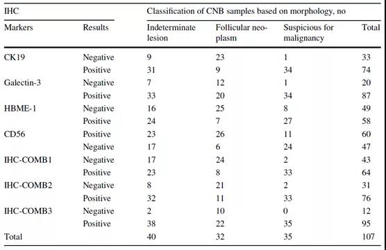 免疫组织化学(IHC)是病理学最常用的辅助技术。以往研究表明,检测CK19、galectin-3、HBME-1和 CD56有助于区分甲状腺结节的良恶性[5,6,7,8]。本研究对CNB样本进行IHC检测分析后发现CK19、galectin-3、HBME-1的阳性率分别为:69.16%、81.31%和54.21%,而CD56阴性率为43.93%(表3)。