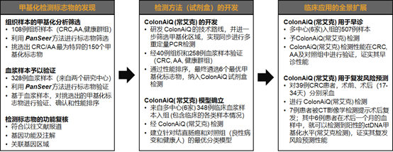 该研究系国内团队第一次系统展示多基因甲基化检测方法(ColonAiQ,常艾克)从标志物筛选、优化到验证的完整过程。常艾克检测结直肠癌平均AUC:0.93,结直肠癌和进展期腺瘤平均AUC:0.84,结直肠癌(I-IV期)的综合灵敏度为86%(149/173),对照组健康人群的检测特异性为92%(125/136)。这是中国团队首次在全球范围内实现结直肠癌筛查及复发预测技术手段合二为一。常艾克亦是全球第一款具备结直肠癌早期筛查和术后监测复合功能的产品。