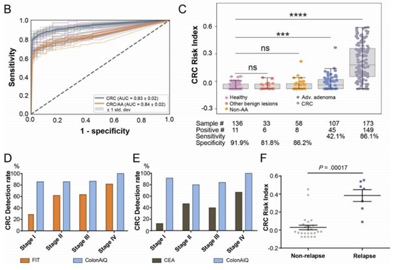 对于常艾克在结直肠癌预后监测中应用潜力,研究团队也进行了探索。所有结直肠癌患者中,39 名患者在手术切除肿瘤前 1-2 天和术后 17-34 天提供了血样。术前常艾克检测阳性的33例患者中,7例(2例II期,5例III期)在术后42至238天出现肿瘤复发(中位数117天)。研究者观察到复发组和非复发组术后样本的常艾克评分存在显著差异 (p=0.00017)(图 3F)。相应的数据表明常艾克在预测结直肠癌的早期复发方面具有明确的识别能力,后续多中心扩大验证正在进行中。
