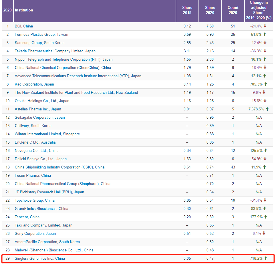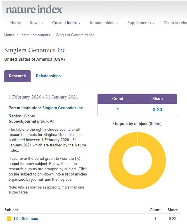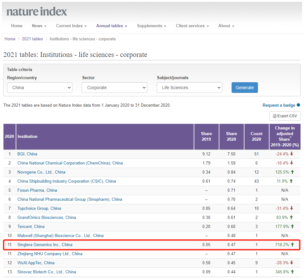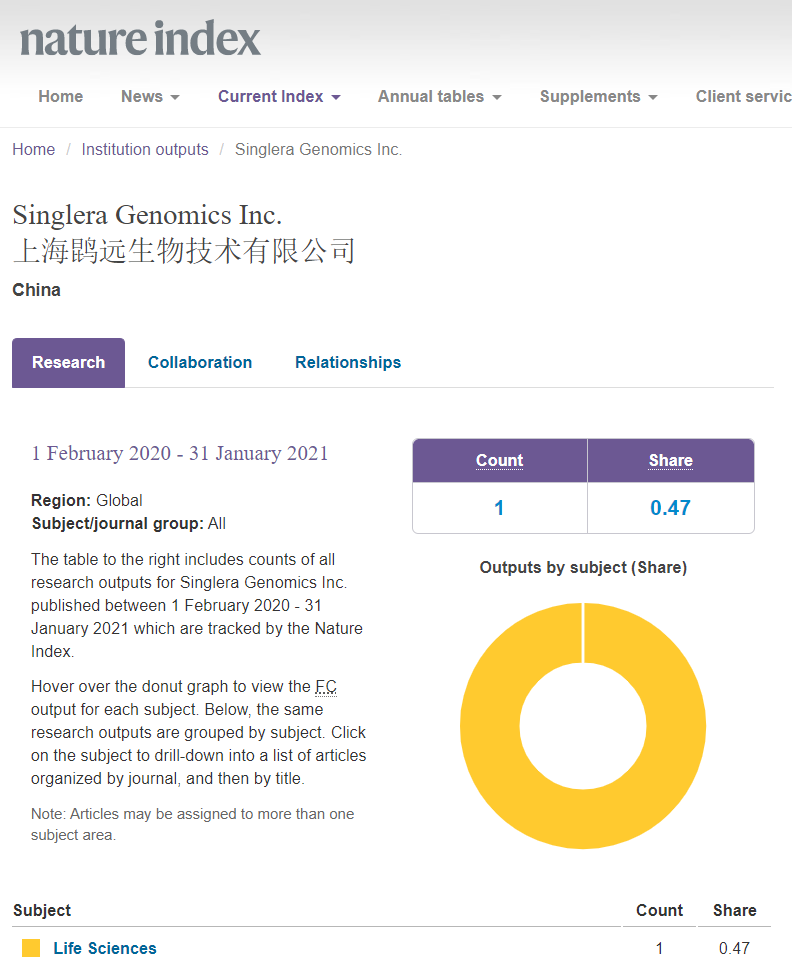 近日,2021自然指数年度榜单(Nature Index 2021 Annual Tables)正式发布。据排行榜显示,上海yl6776永利集团技术有限公司(Singlera Genomics Inc.,China)位列中国生命科学产业机构榜Top 50第11名,亚太地区生命科学产业机构榜Top 50第29名,并且是2019-2020年自然指数上升率最高的中国公司。