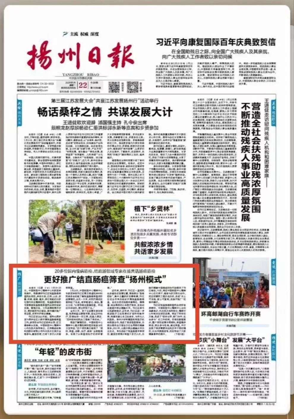 来源:扬州日报2023年5月22日头版文章《20多位国内慢病防控、结直肠领域专家在扬共话肠癌防控:更好推广结直肠癌筛查“扬州模式”》
