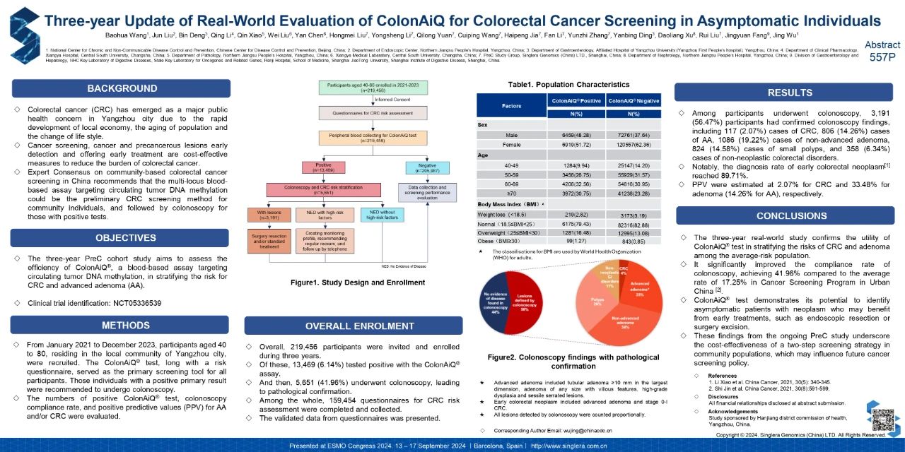 2024年9月,在欧洲肿瘤医学协会(ESMO)大会上,yl6776永利集团展示了基于血液的结直肠癌检测技术常艾克®的三年真实世界研究结果。研究项目使用常艾克®检测循环肿瘤DNA(ctDNA)甲基化,帮助分层筛查无症状个体中的结直肠癌(CRC)及高级腺瘤(AA)的风险。研究结果显示,在提升筛查依从性以及早期发现癌症方面这一技术显现出应用潜力。