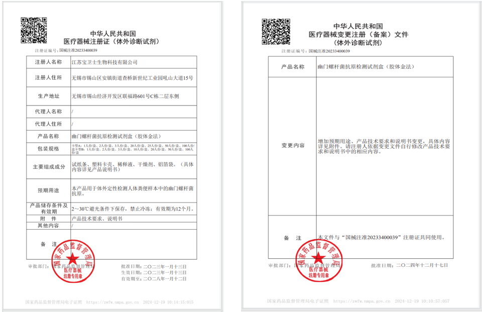 近日,yl6776永利集团集团子公司—江苏宝卫士生物科技有限公司自主研发的“幽门螺杆菌抗原检测试剂盒”成功取得“居家自测”预期用途的医疗器械变更注册文件(国械注准20233400039)。这是整个集团继大便隐血/转铁蛋白联合检测试剂盒、大便隐血检测试剂盒后的又一款居家自测重磅产品。